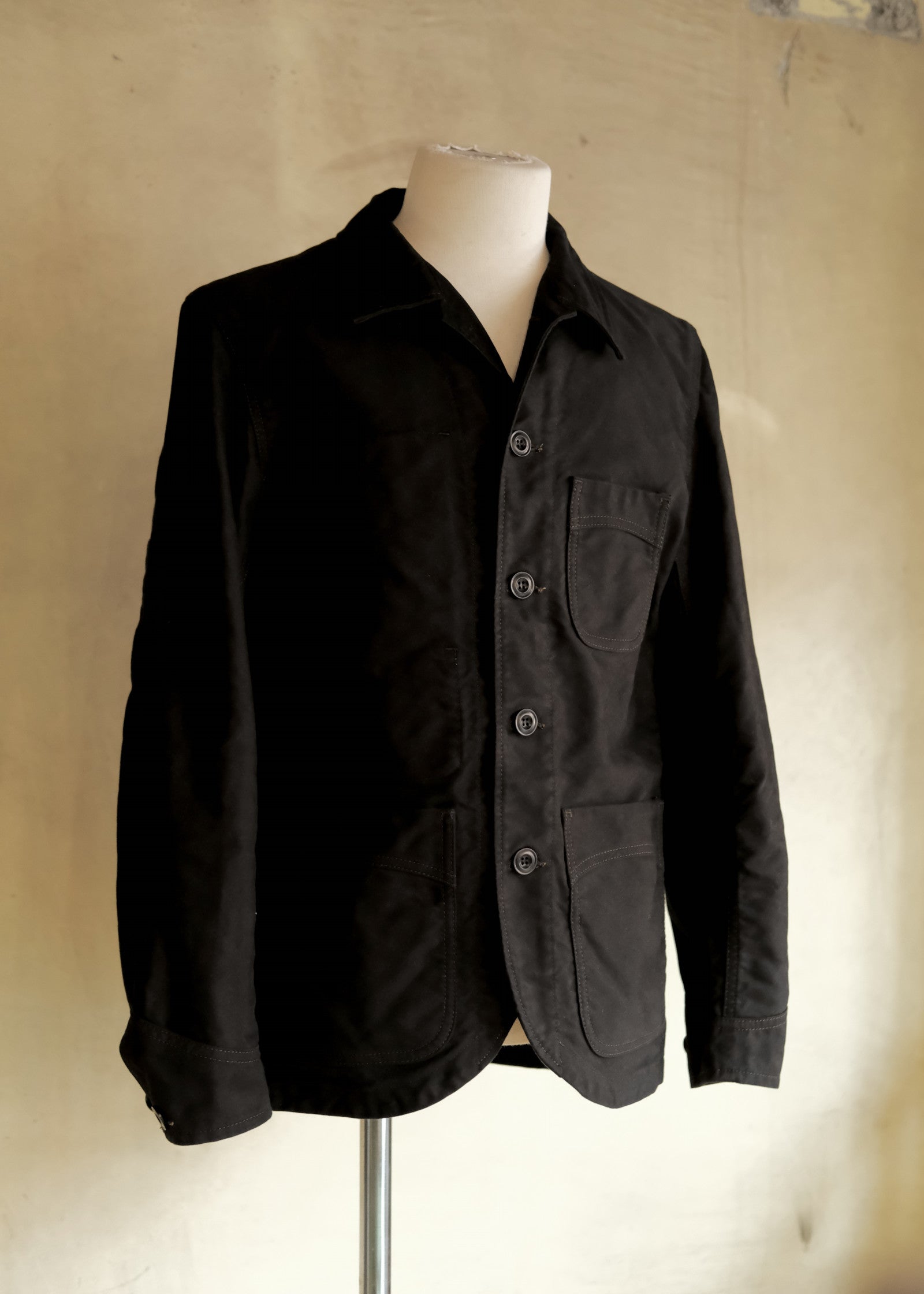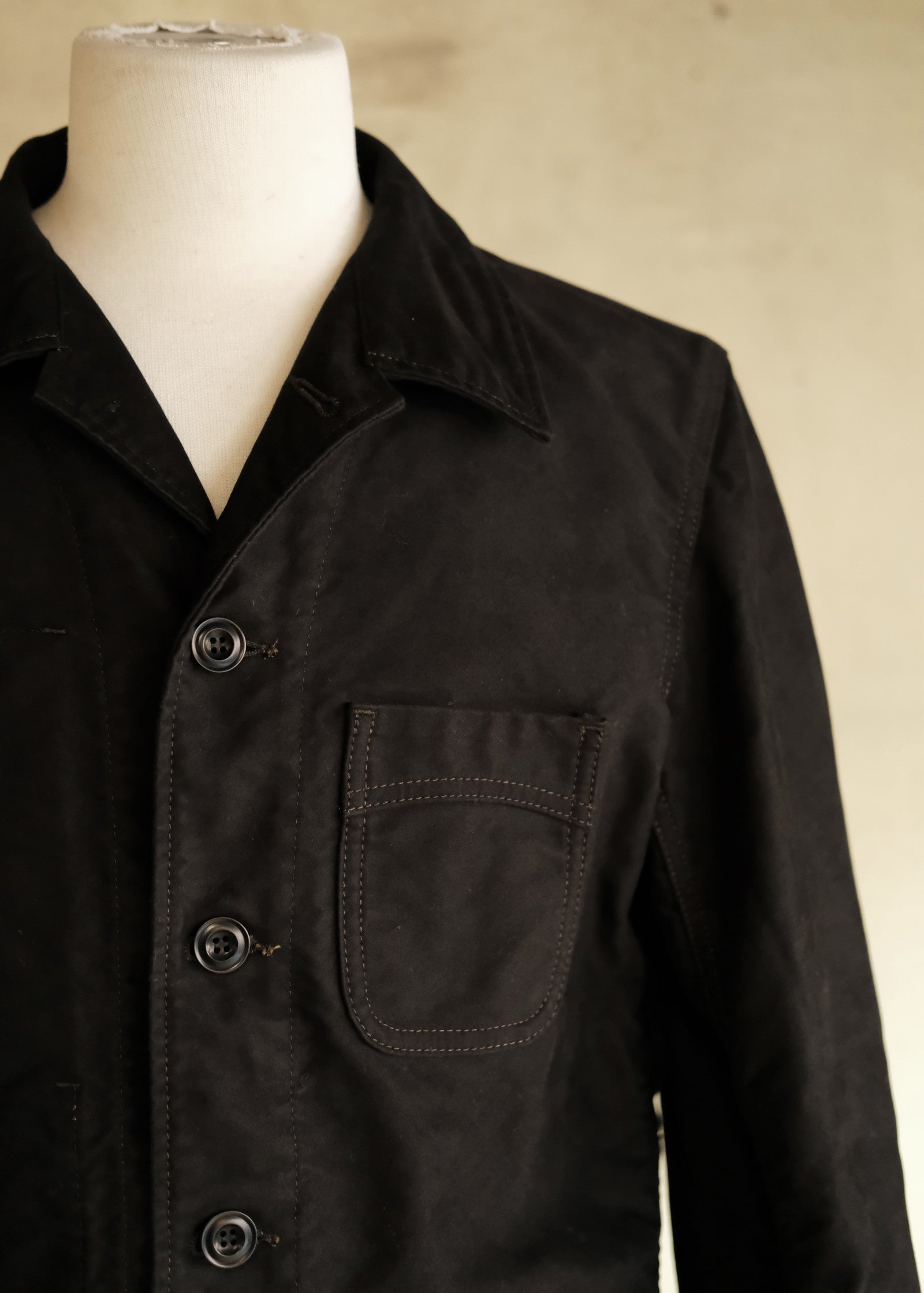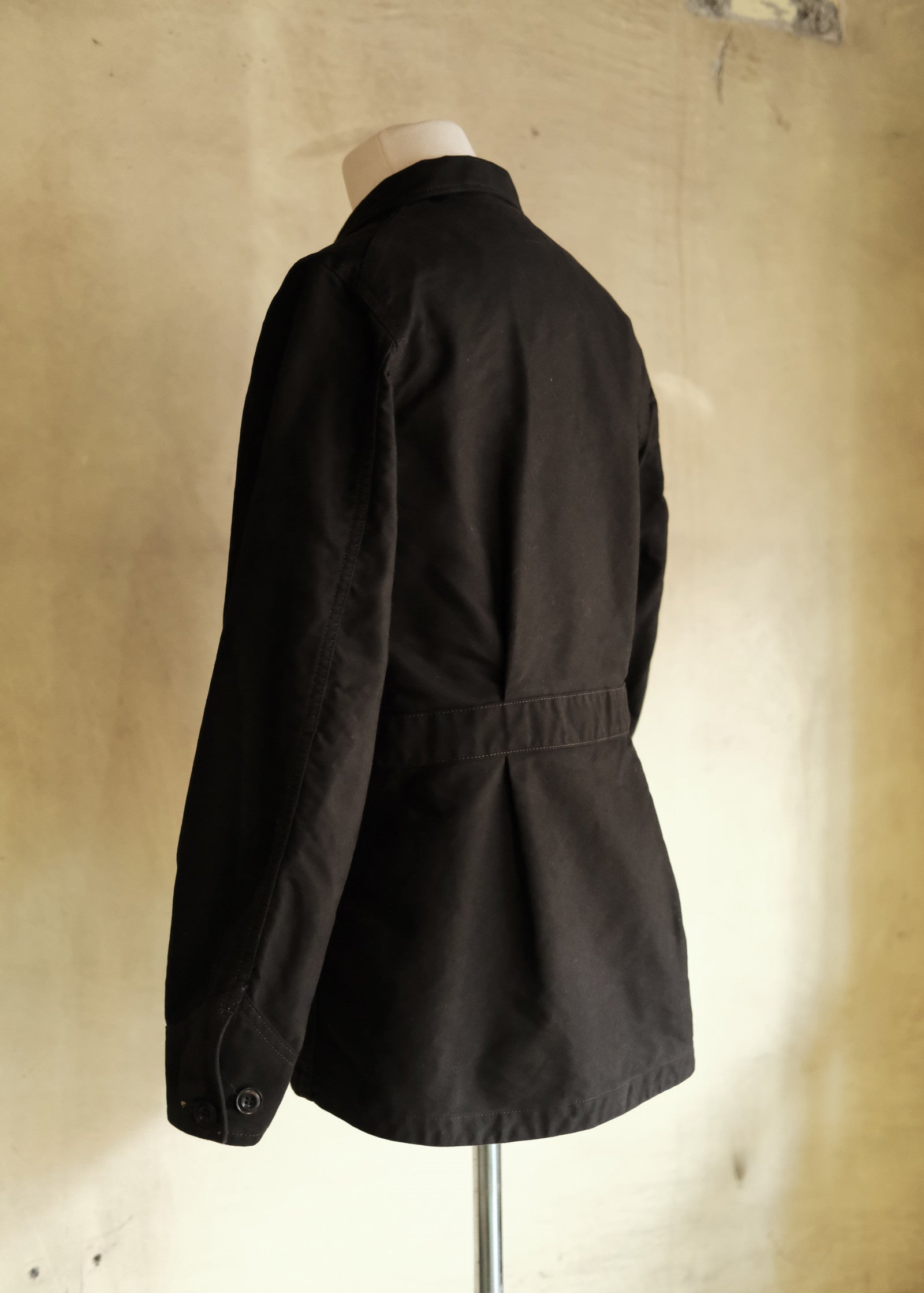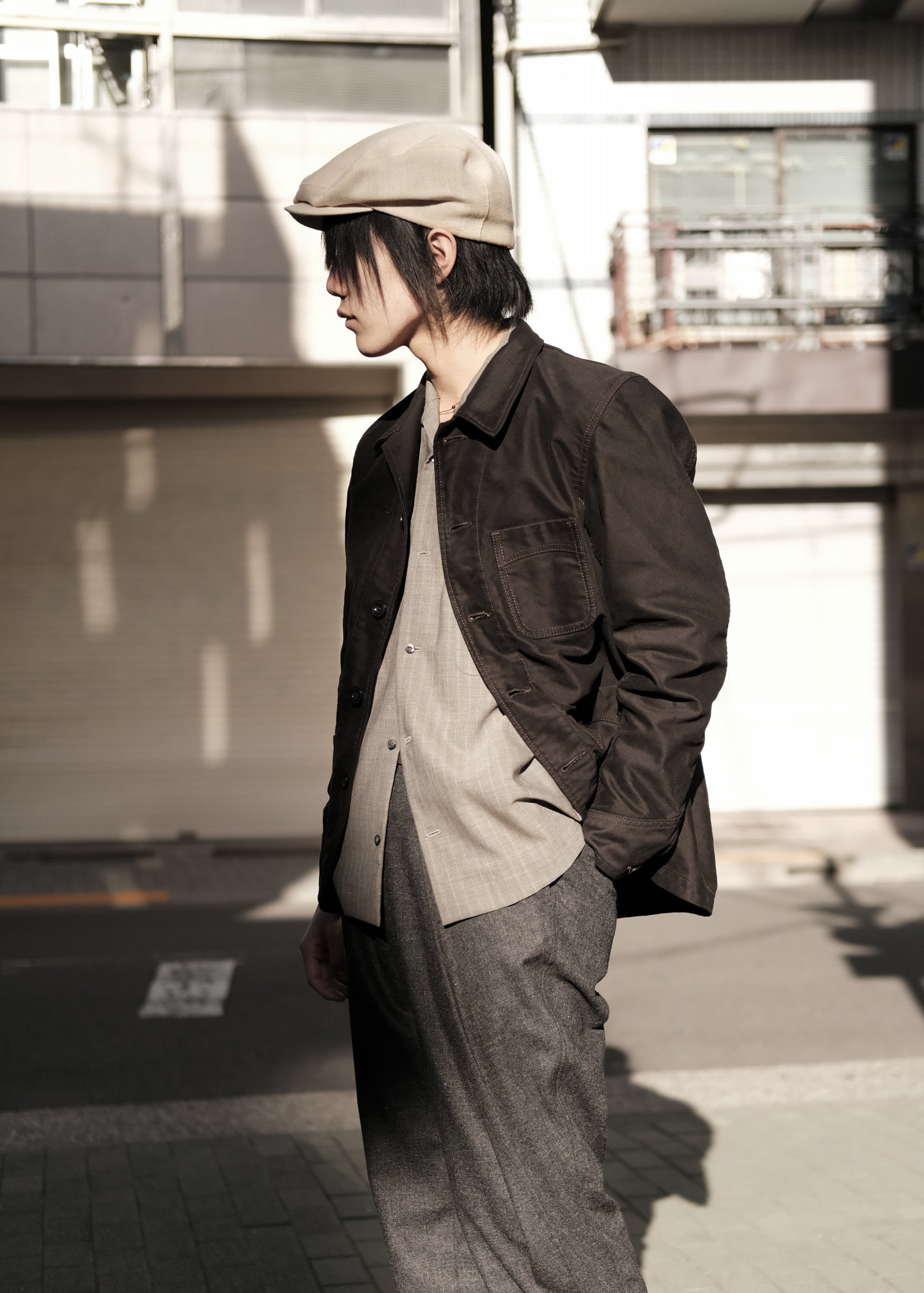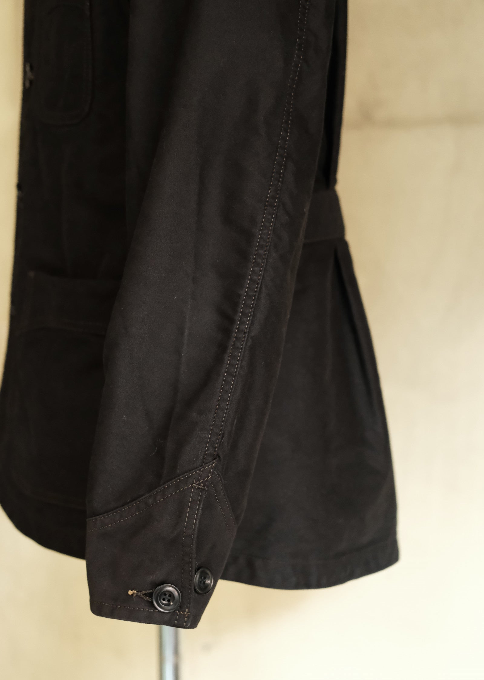 本作はその伝統を受け継ぎつつ、袖付けをテーラードジャケットのように縦方向に落とすことで、ワーク由来でありながらすっきりと美しいシルエットを実現しました。