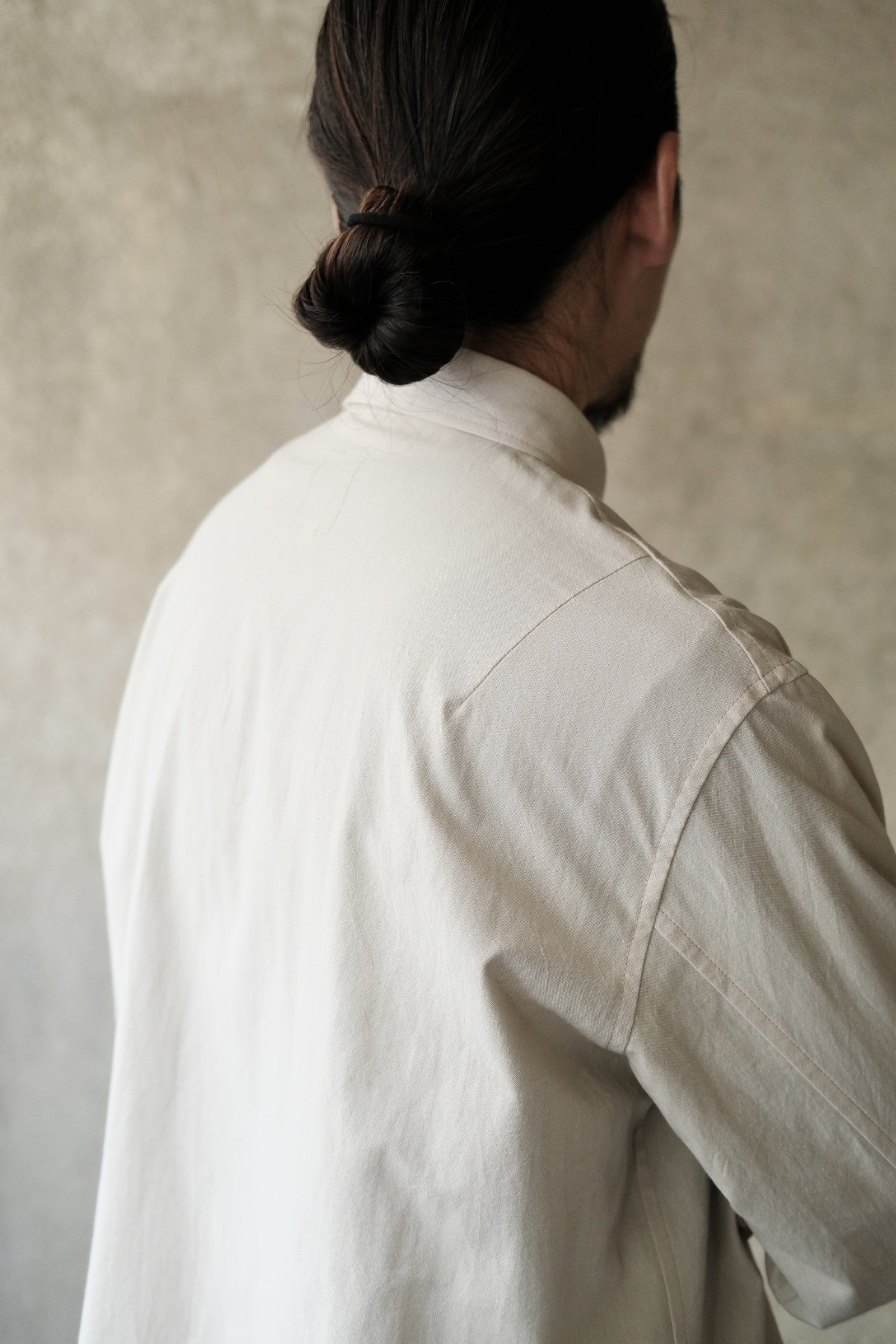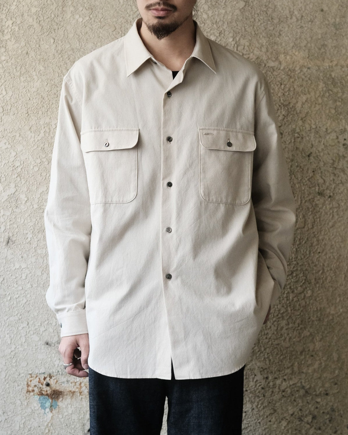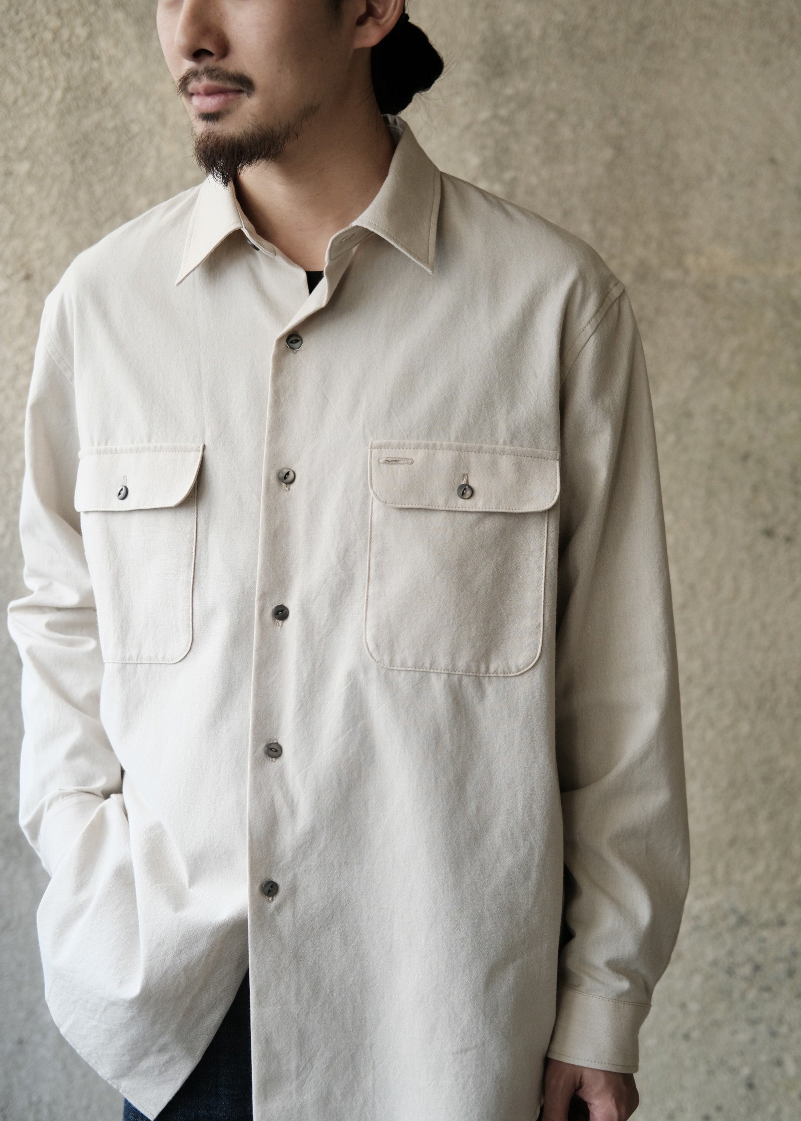 シャツにしては少し太めの糸ですが、少し甘めの密度と糸本来の起毛感を残したシンプルな洗い加工により、肌馴染みの良く柔らかい、とても優しい質感の生地となりました。
