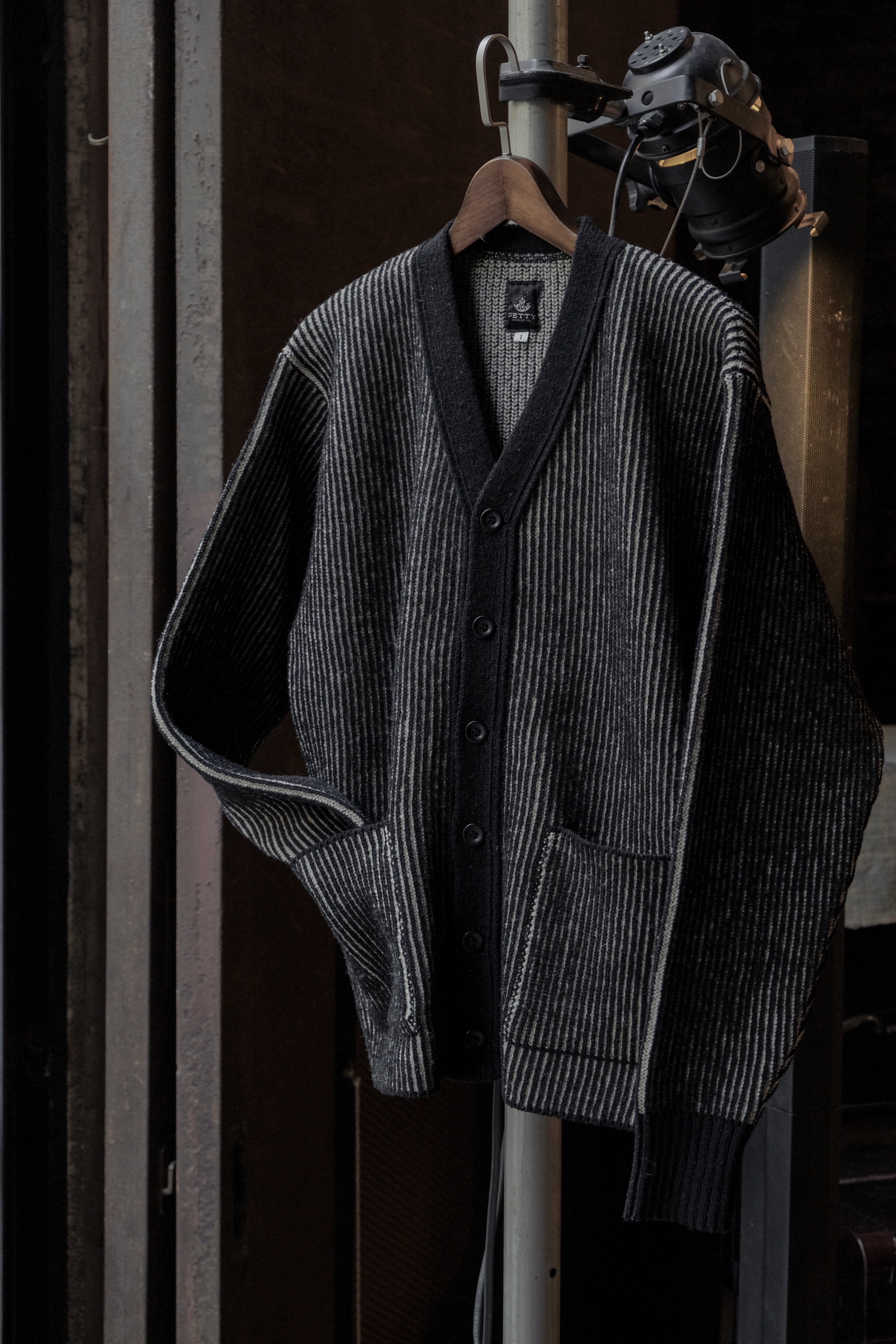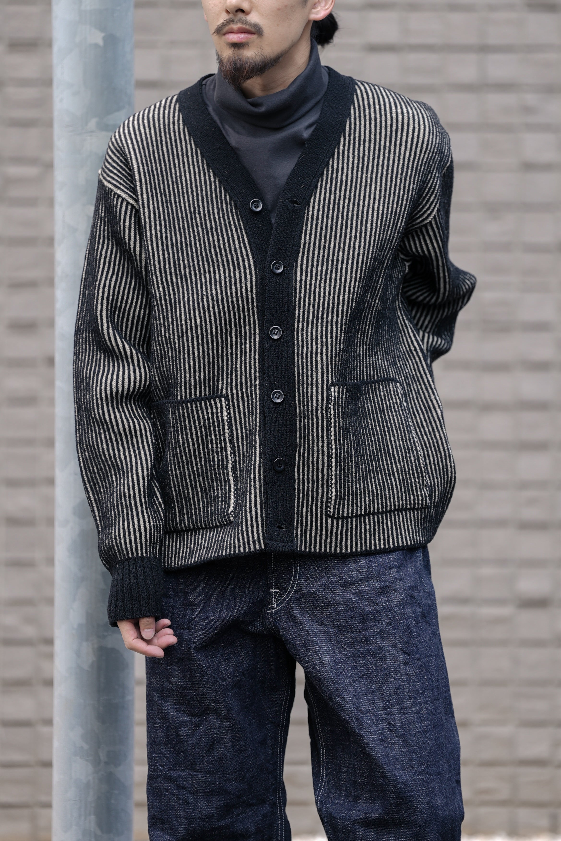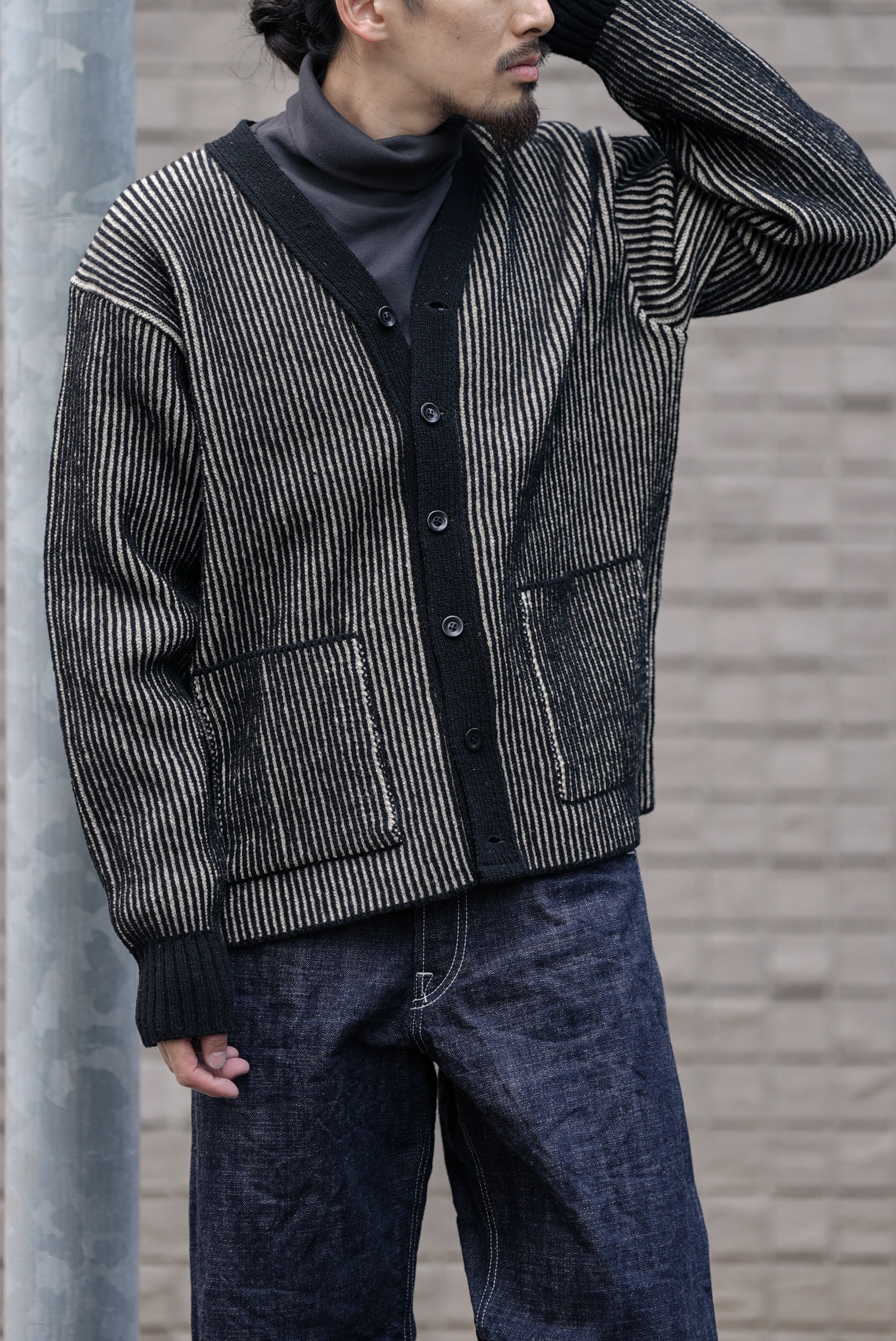 1950年代アメリカのアイビーリーグ学生やジャズミュージシャンたちが軽やかに羽織ったカーディガン文化を背景に、知的でリラックスした印象を持つボックスシルエットと狭めのVゾーンを採用。