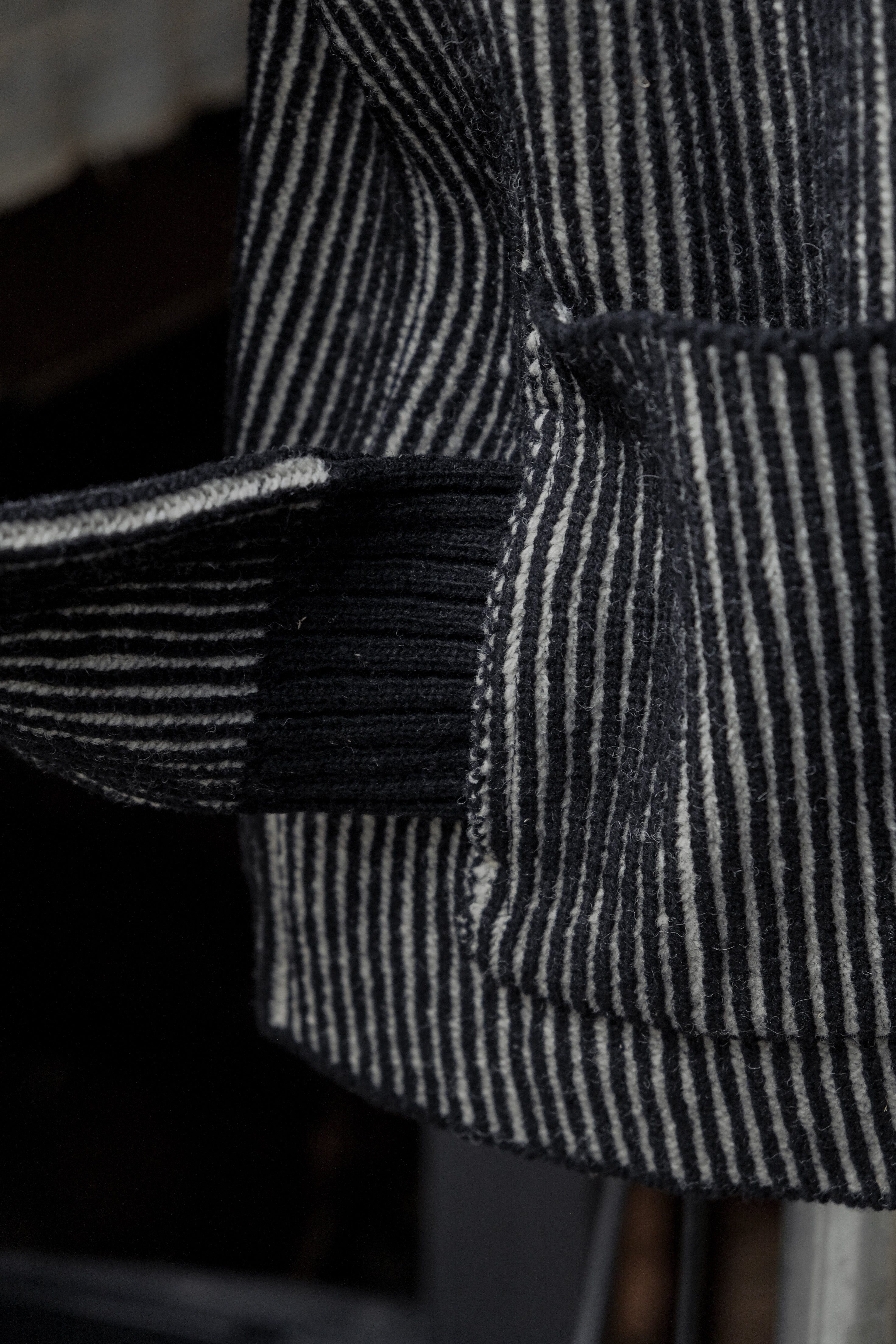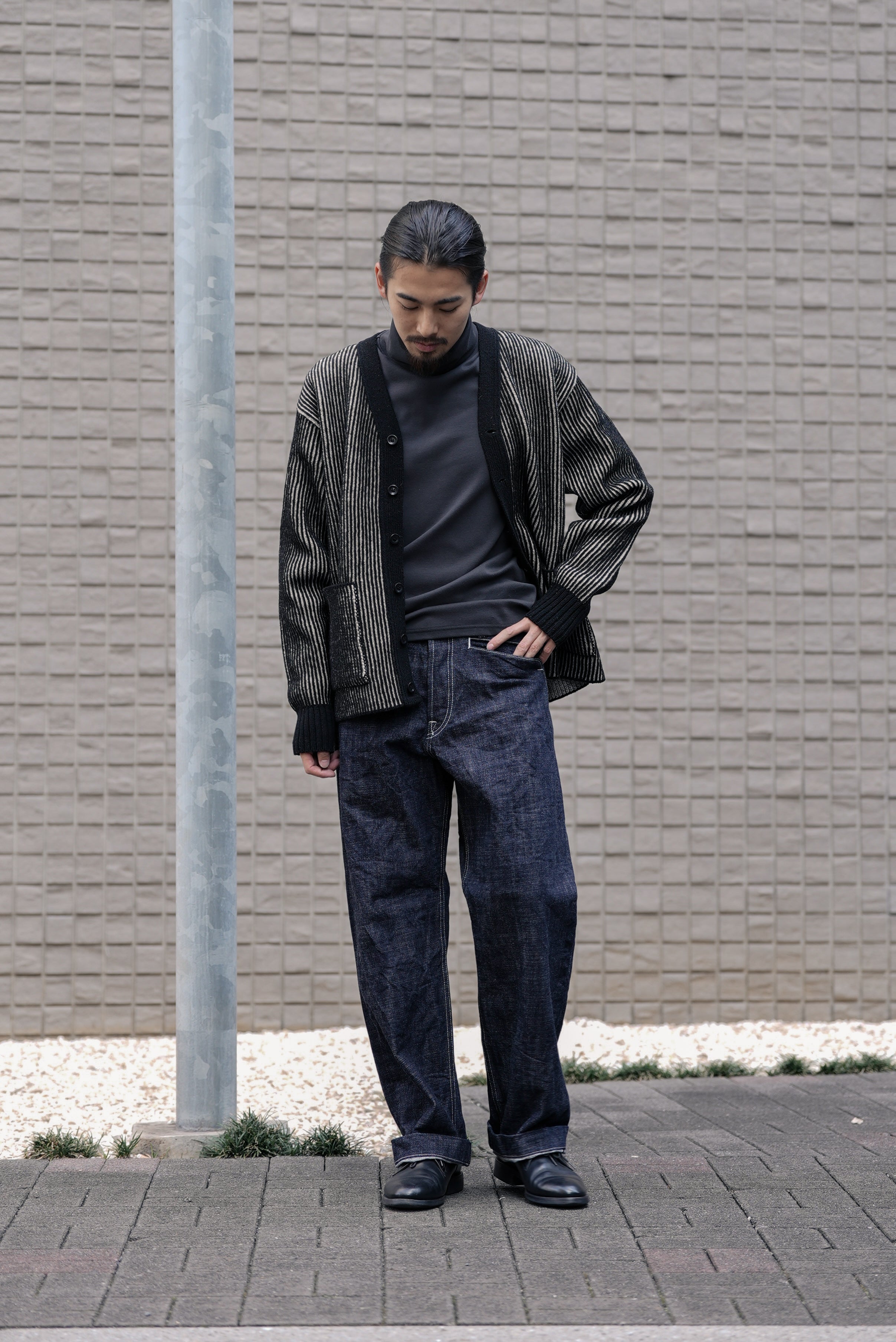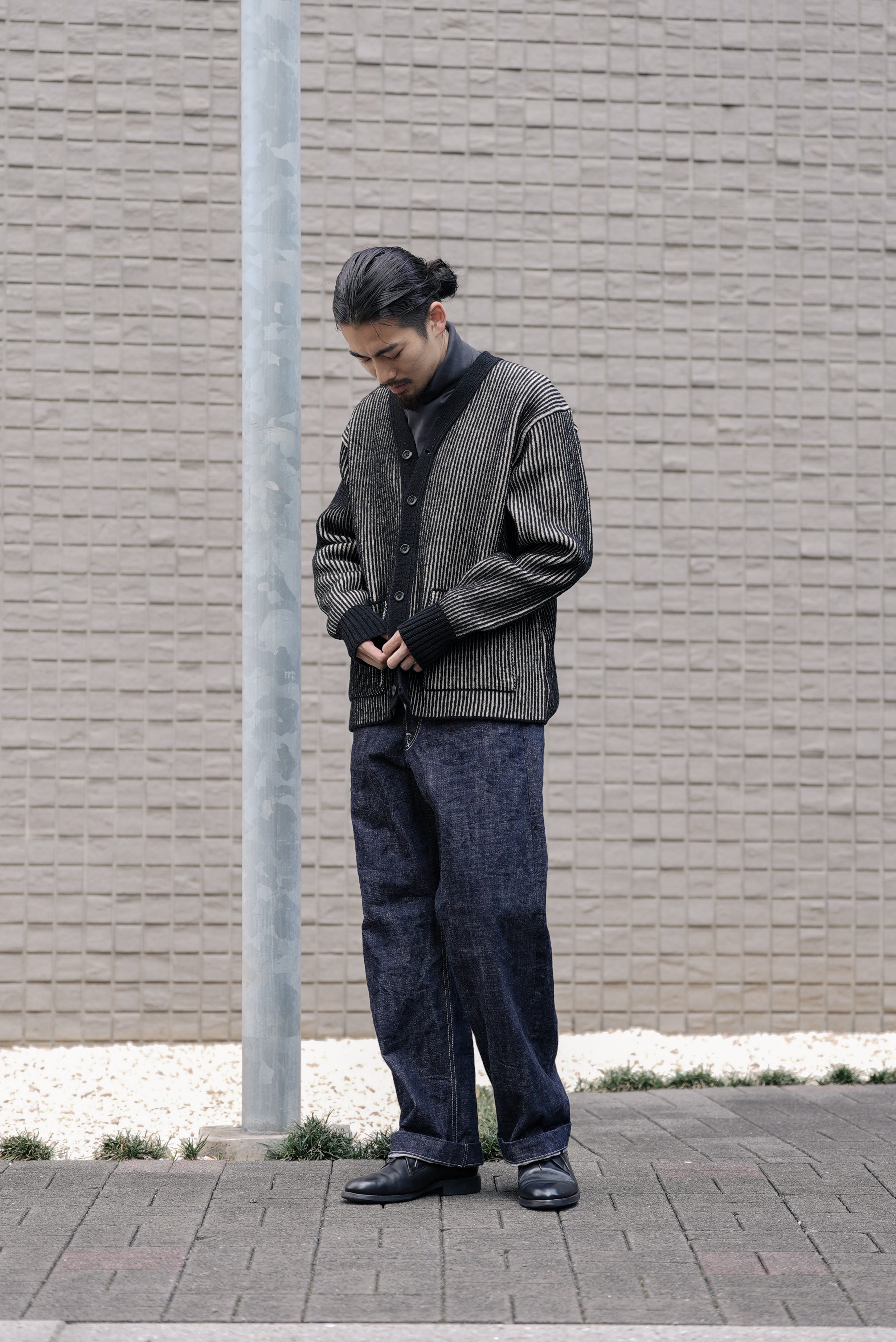 1950年代アメリカのアイビーリーグ学生やジャズミュージシャンたちが軽やかに羽織ったカーディガン文化を背景に、知的でリラックスした印象を持つボックスシルエットと狭めのVゾーンを採用。