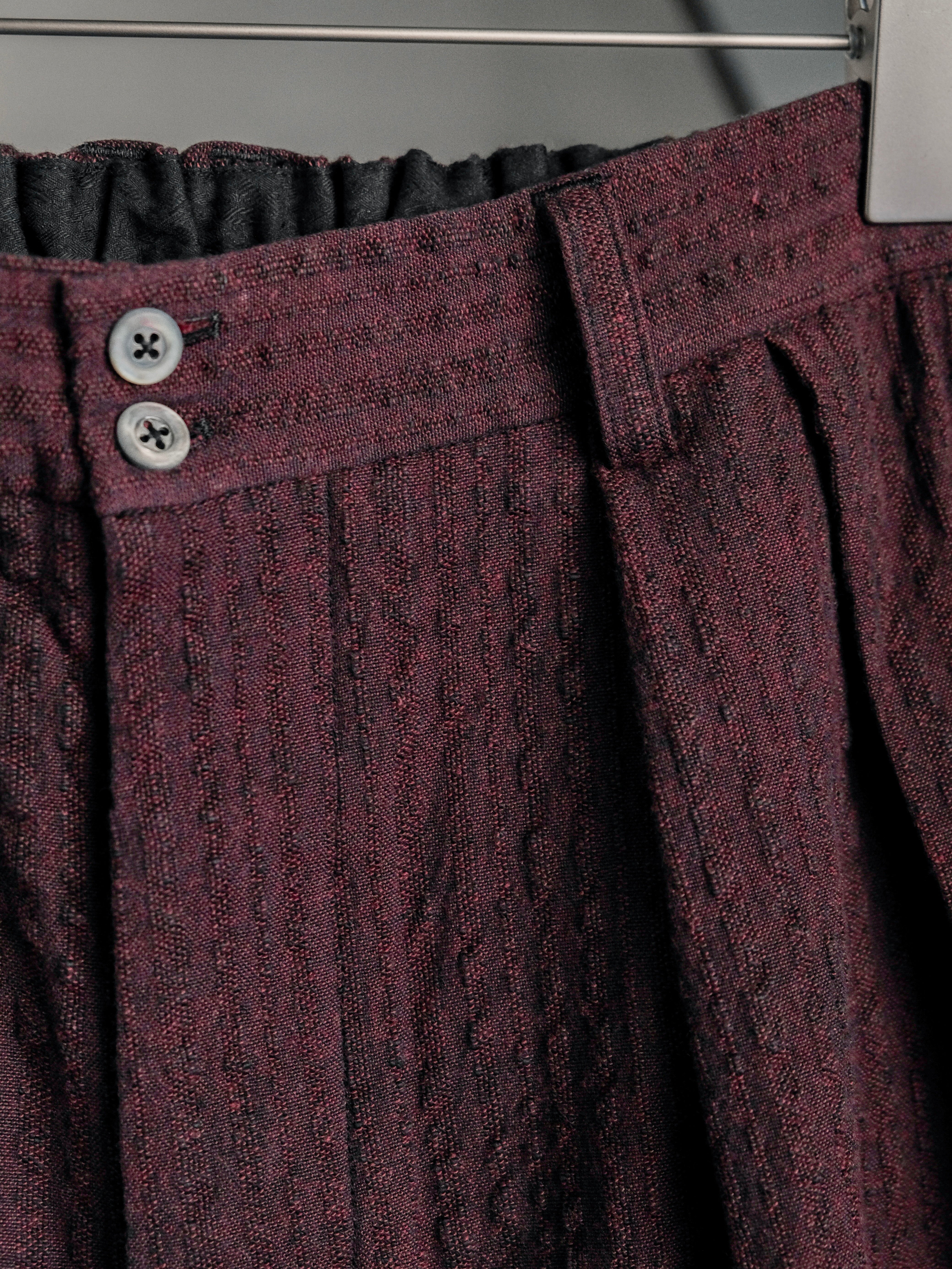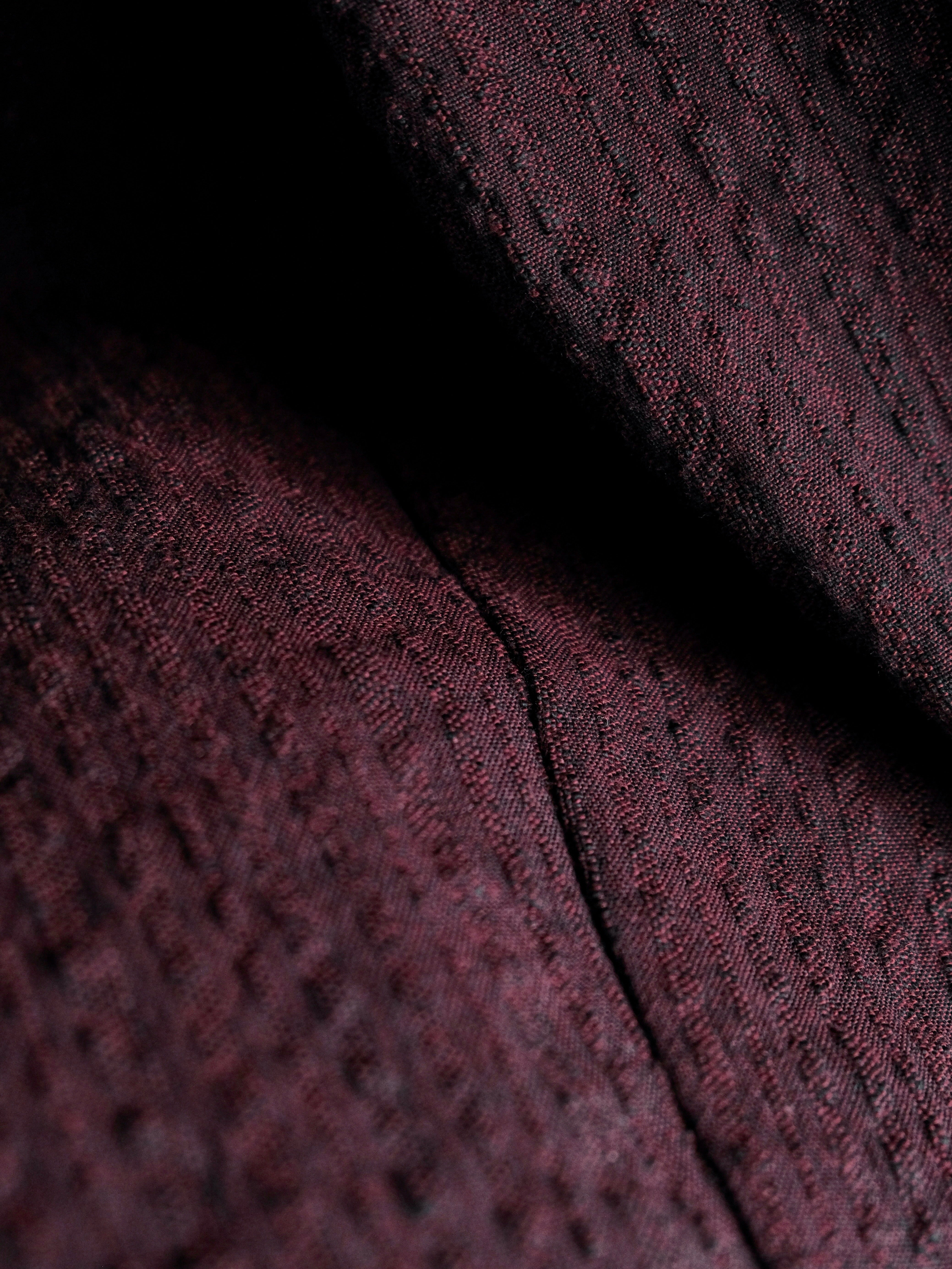 タテ糸に黒、ヨコ糸に赤を打ち込むことで、陰影のある奥行きと独特の深みを表現しました。