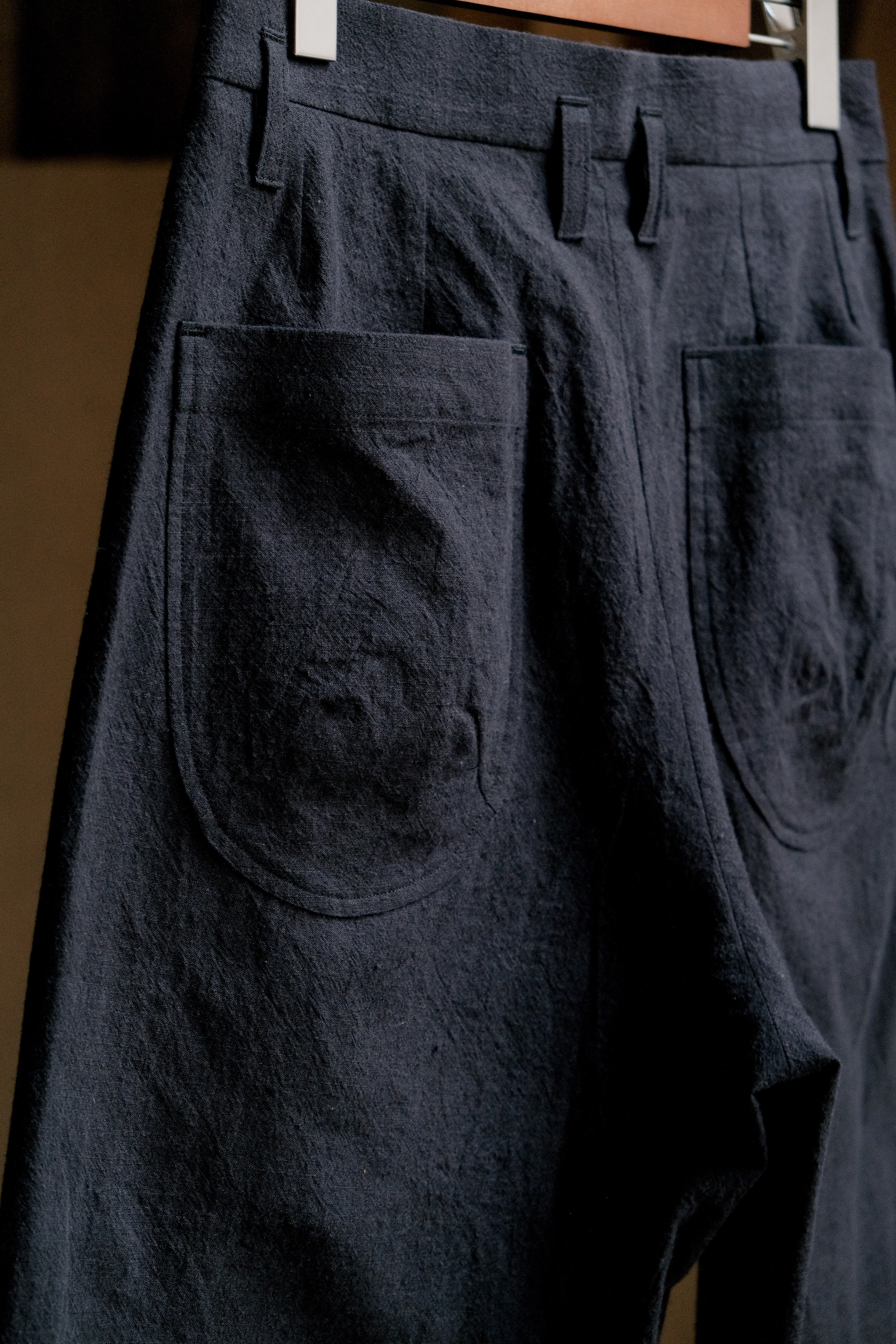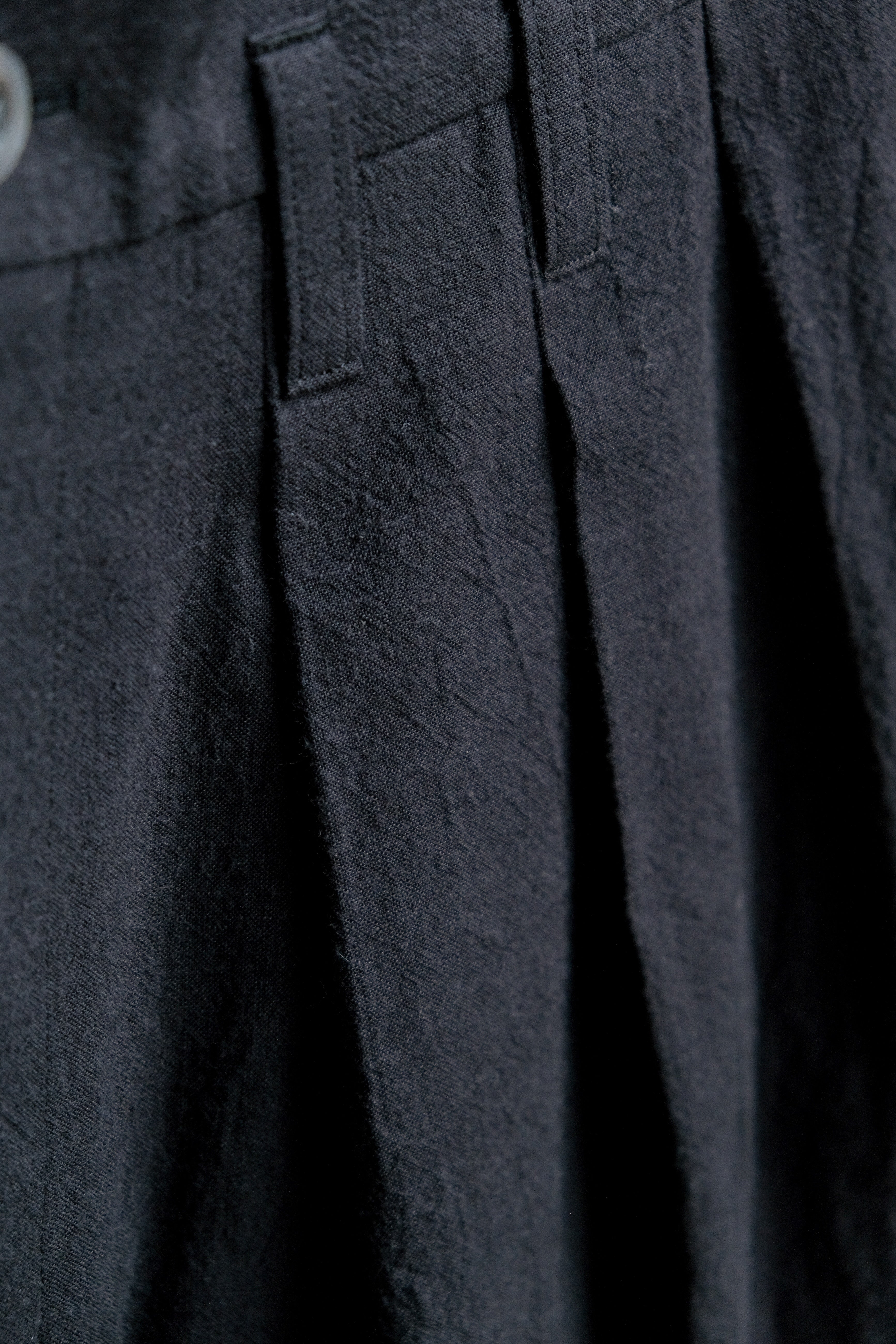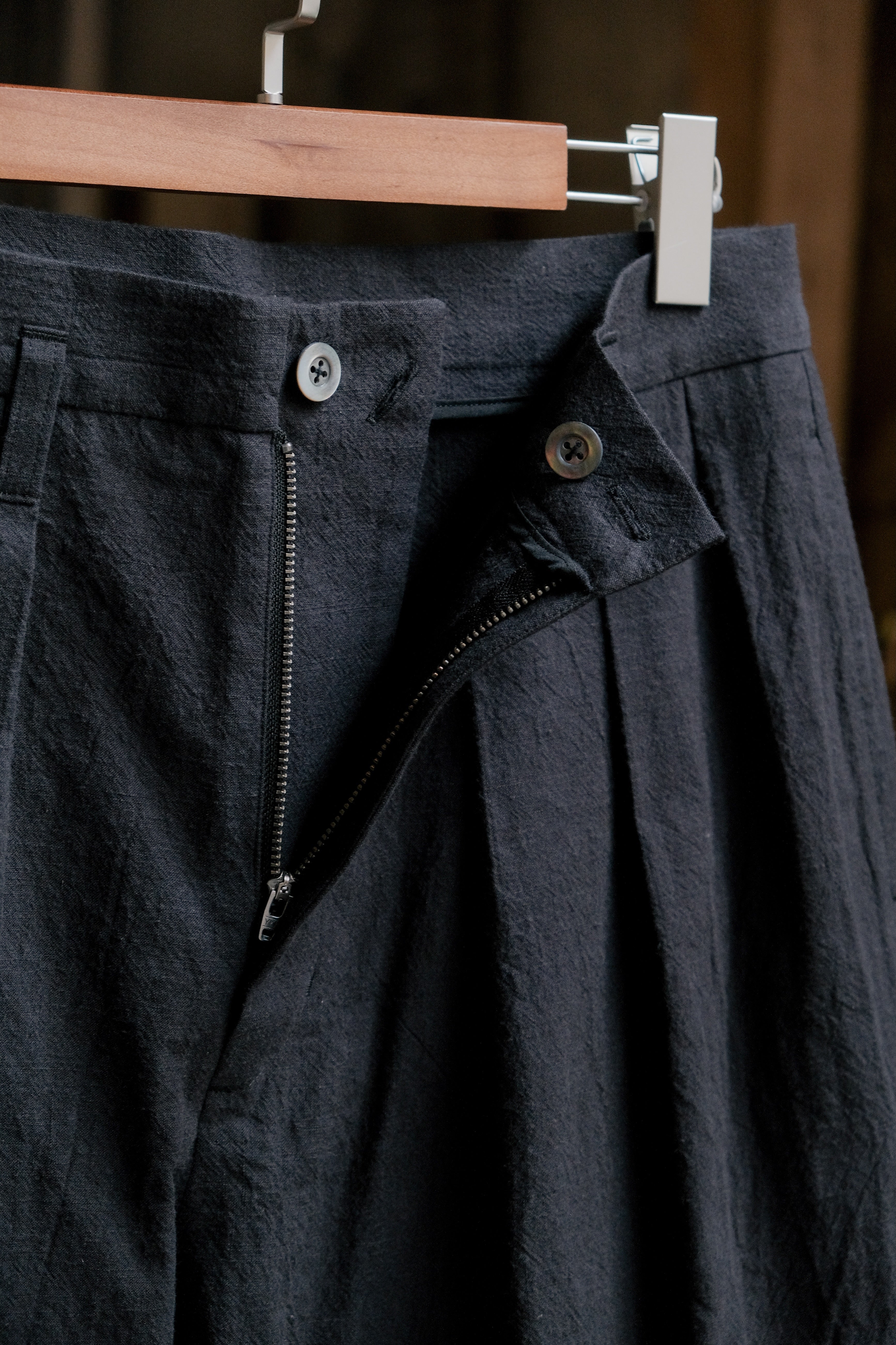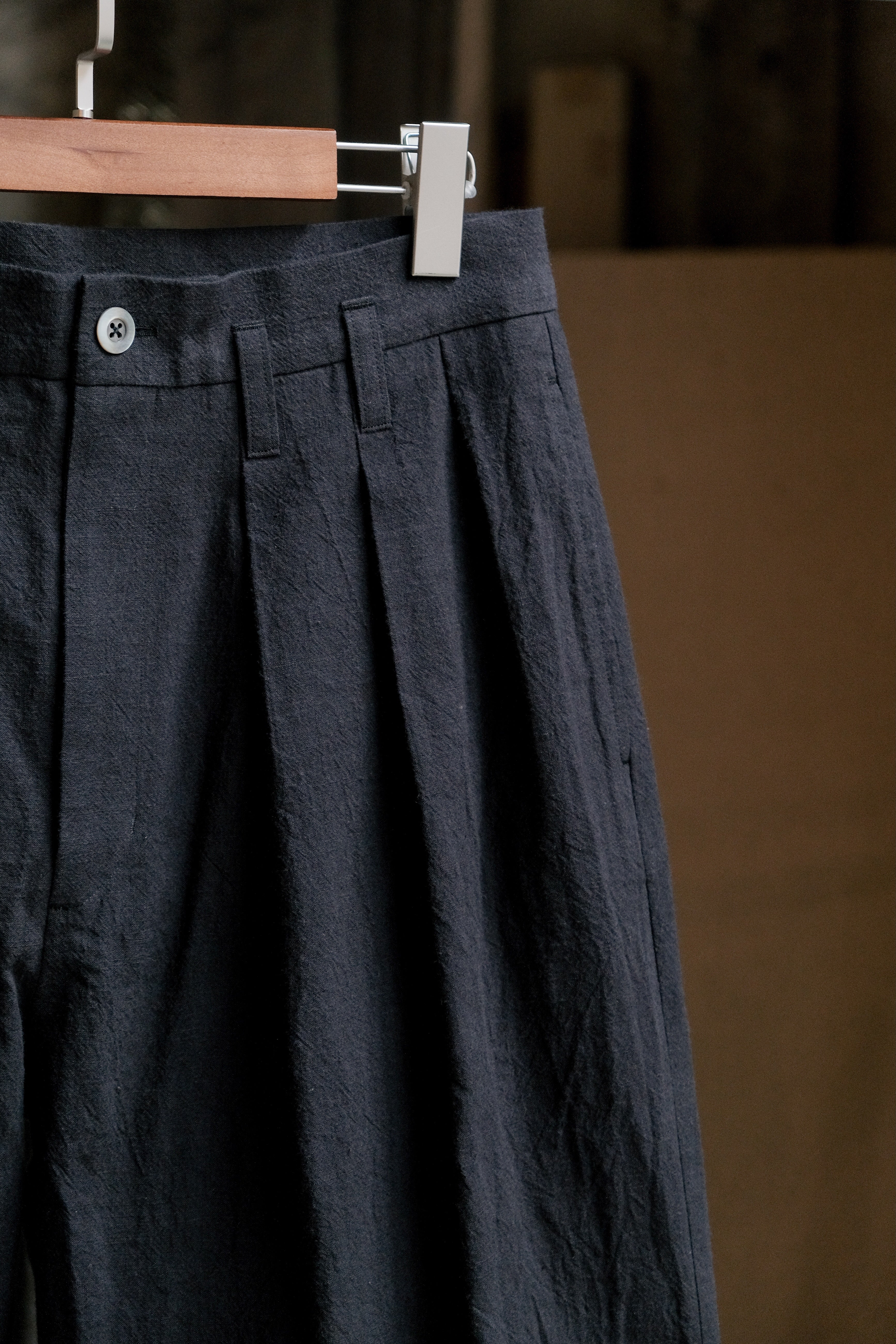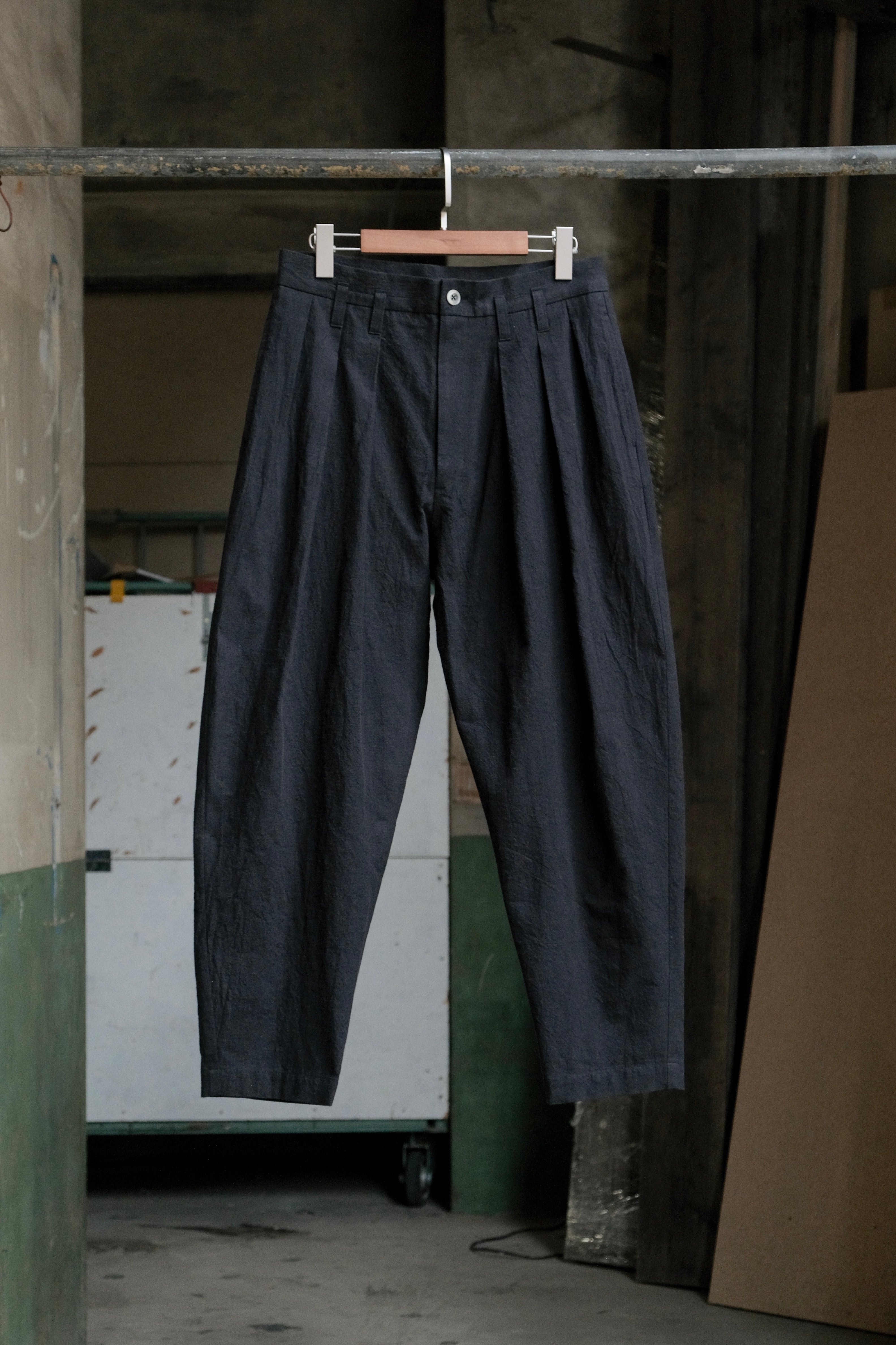 3本のタックは体の動きに合わせて広がり、極端に太い腿部分から裾までのテーパードで綺麗に絞られるバルーンシルエットです。