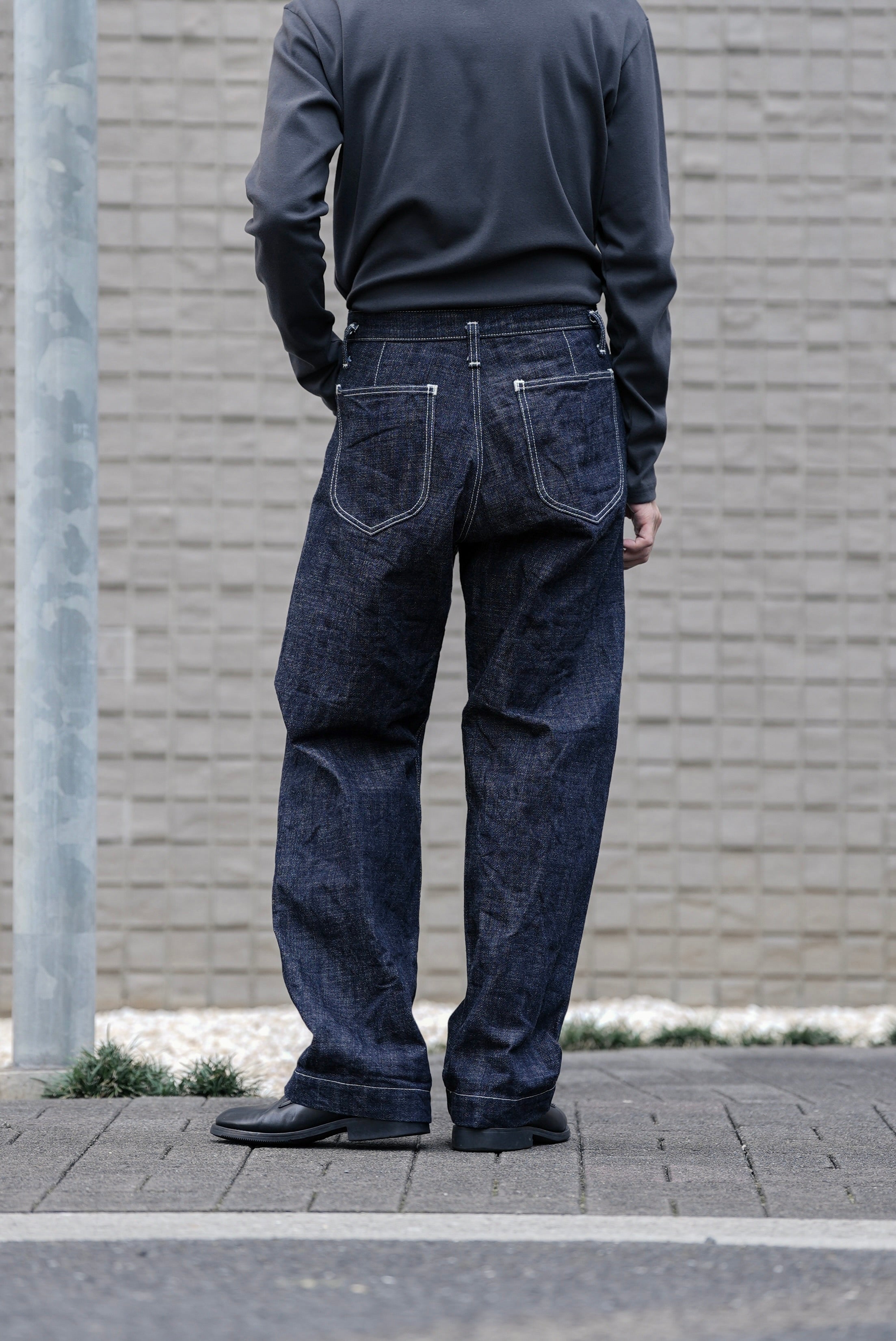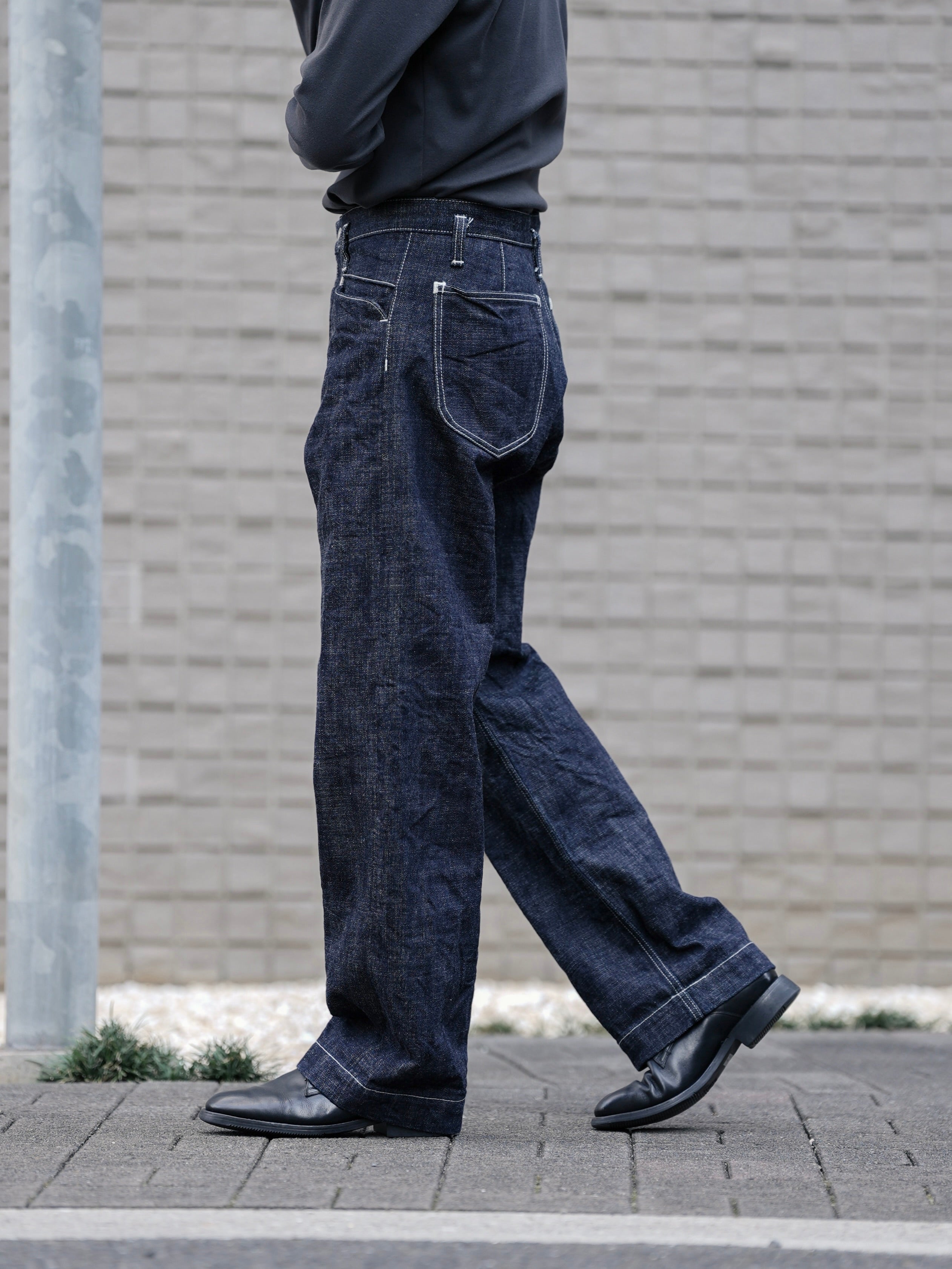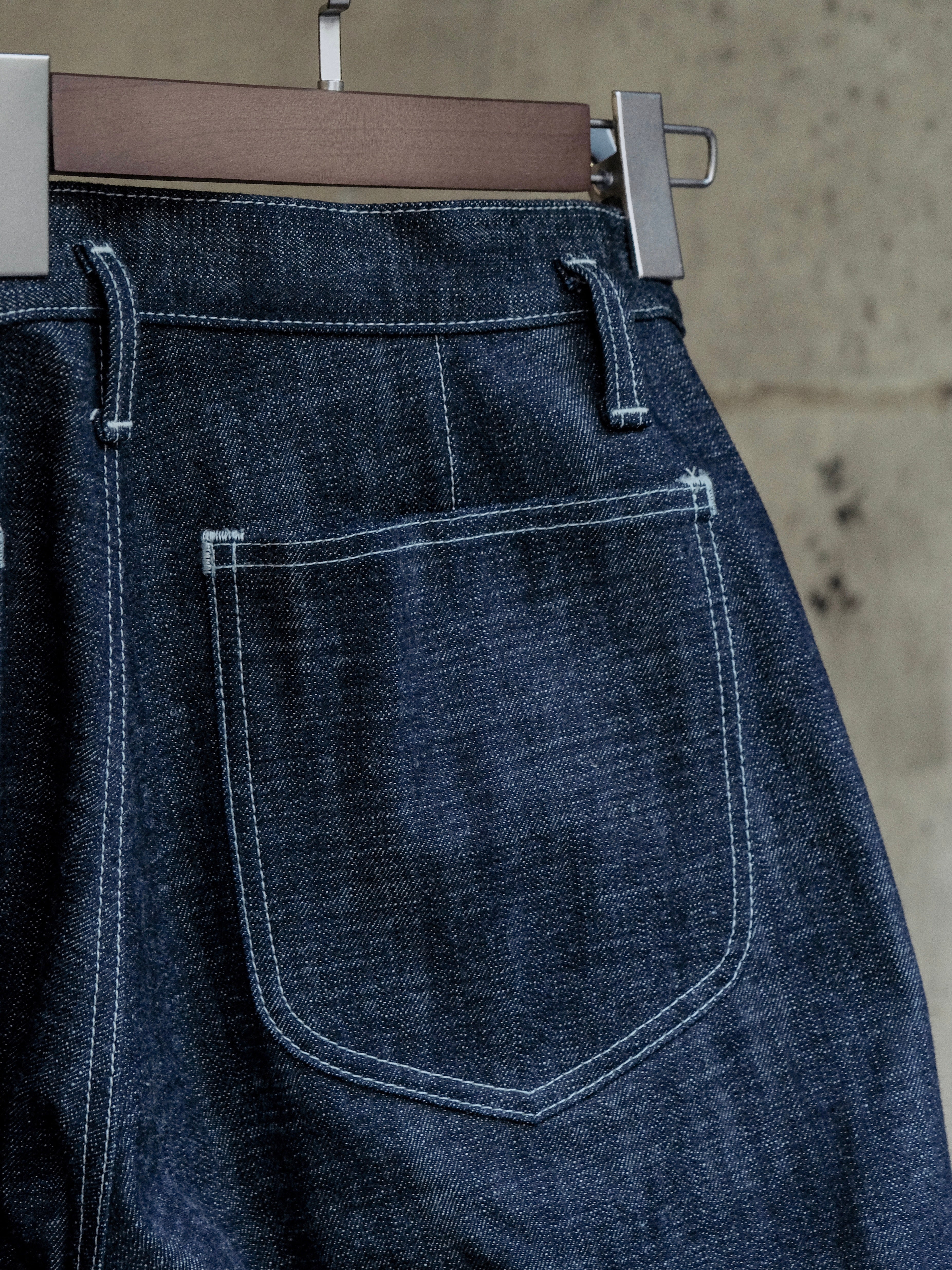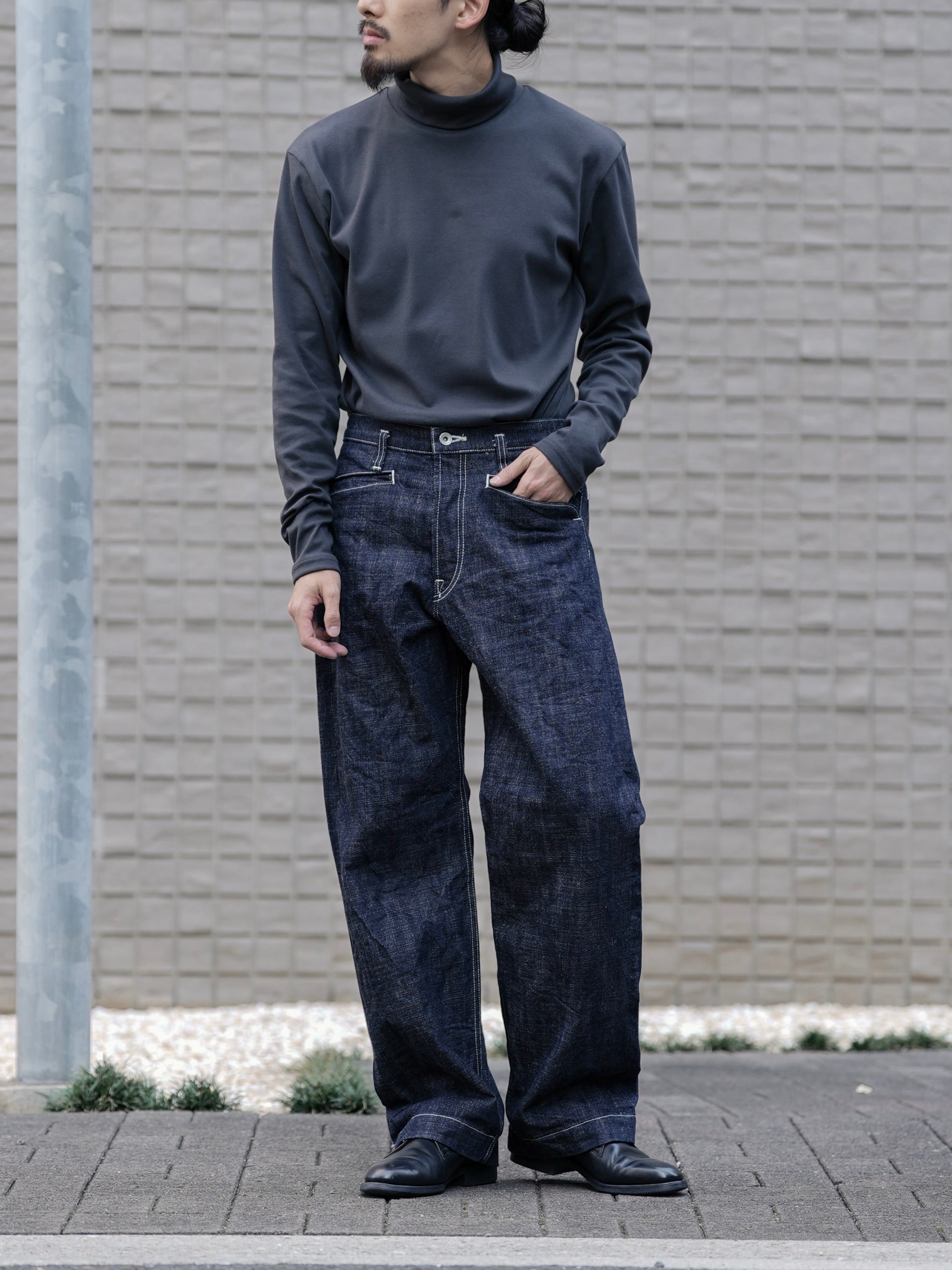 本作はその文化の流れを踏まえ、アメリカ由来のワイドストレートシルエットを基調にしながら、ヨーロッパ的な感覚を映したカーブのあるポケットに。