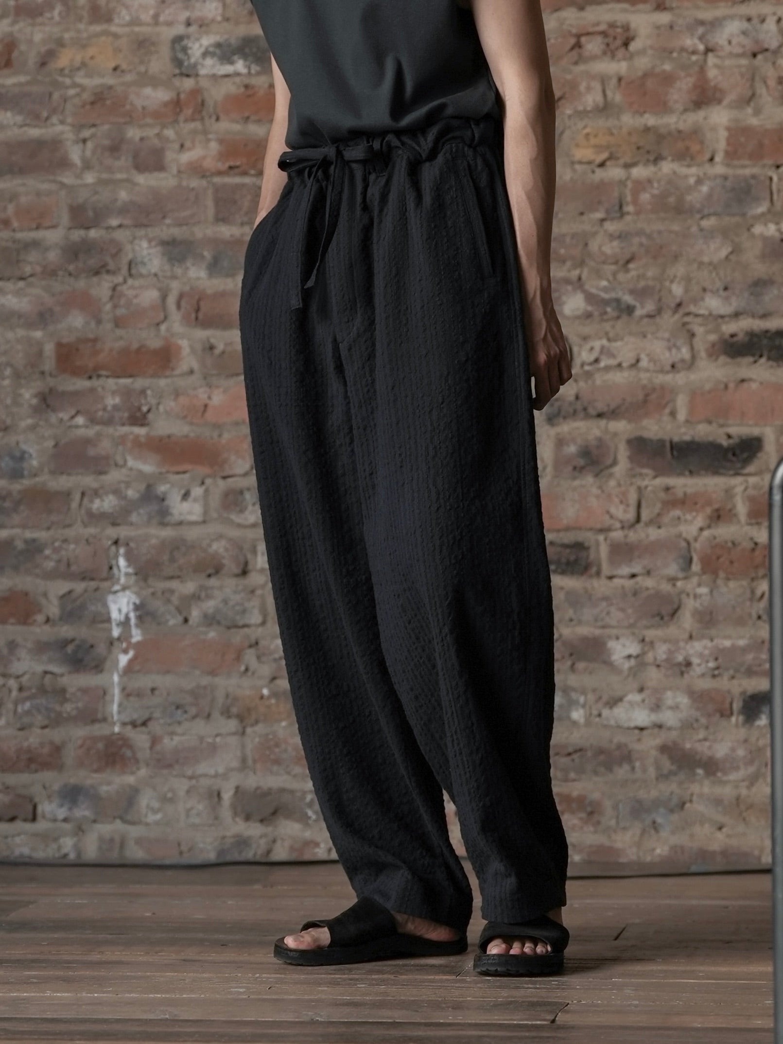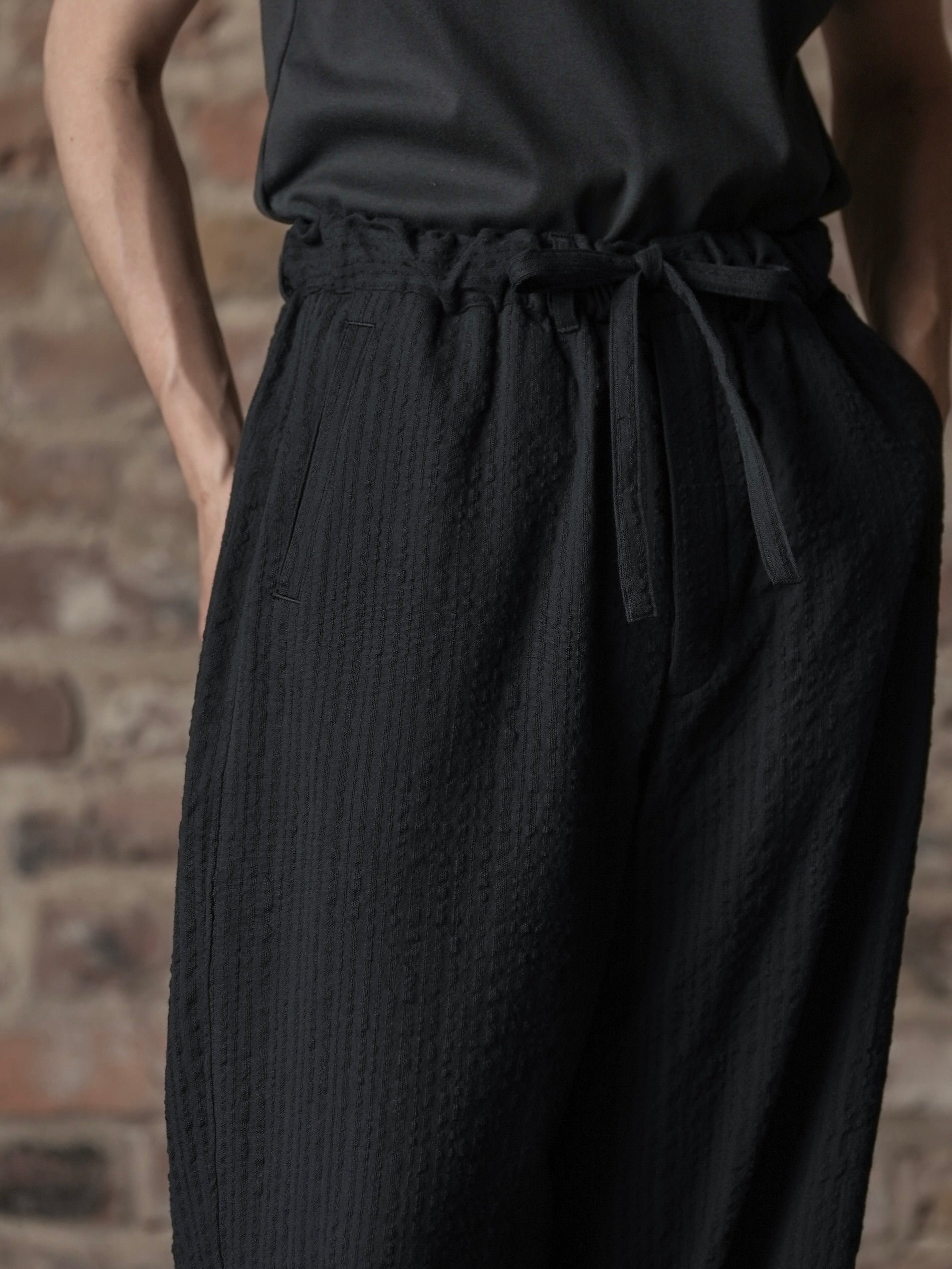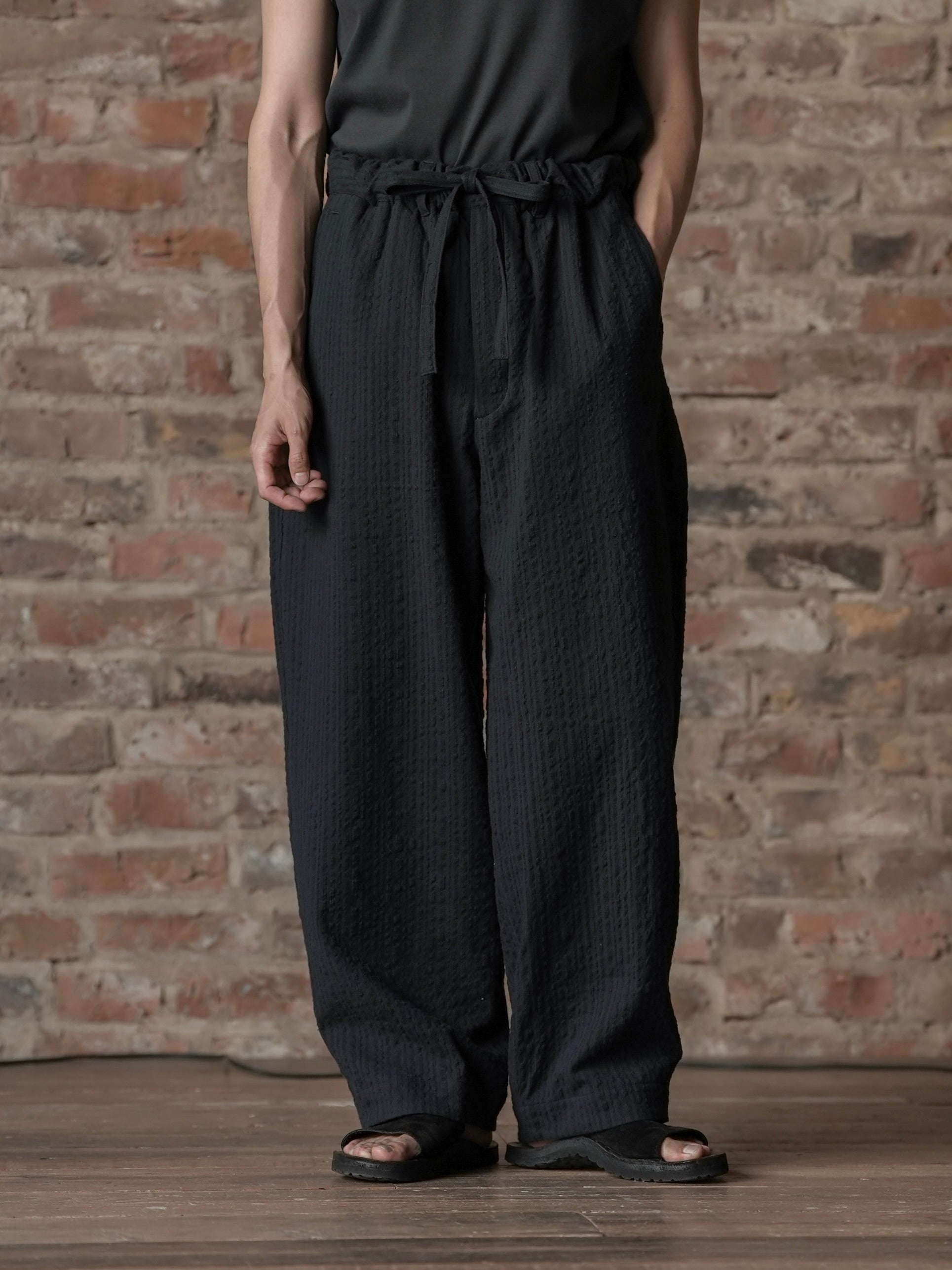 ウエストはゴムとドローコード仕様で、ストレスのない着用感を実現しつつ、ベルトループやボタンフライなどのディテールを残すことで、クラシックな温度感を損なわないデザインに仕上げています。